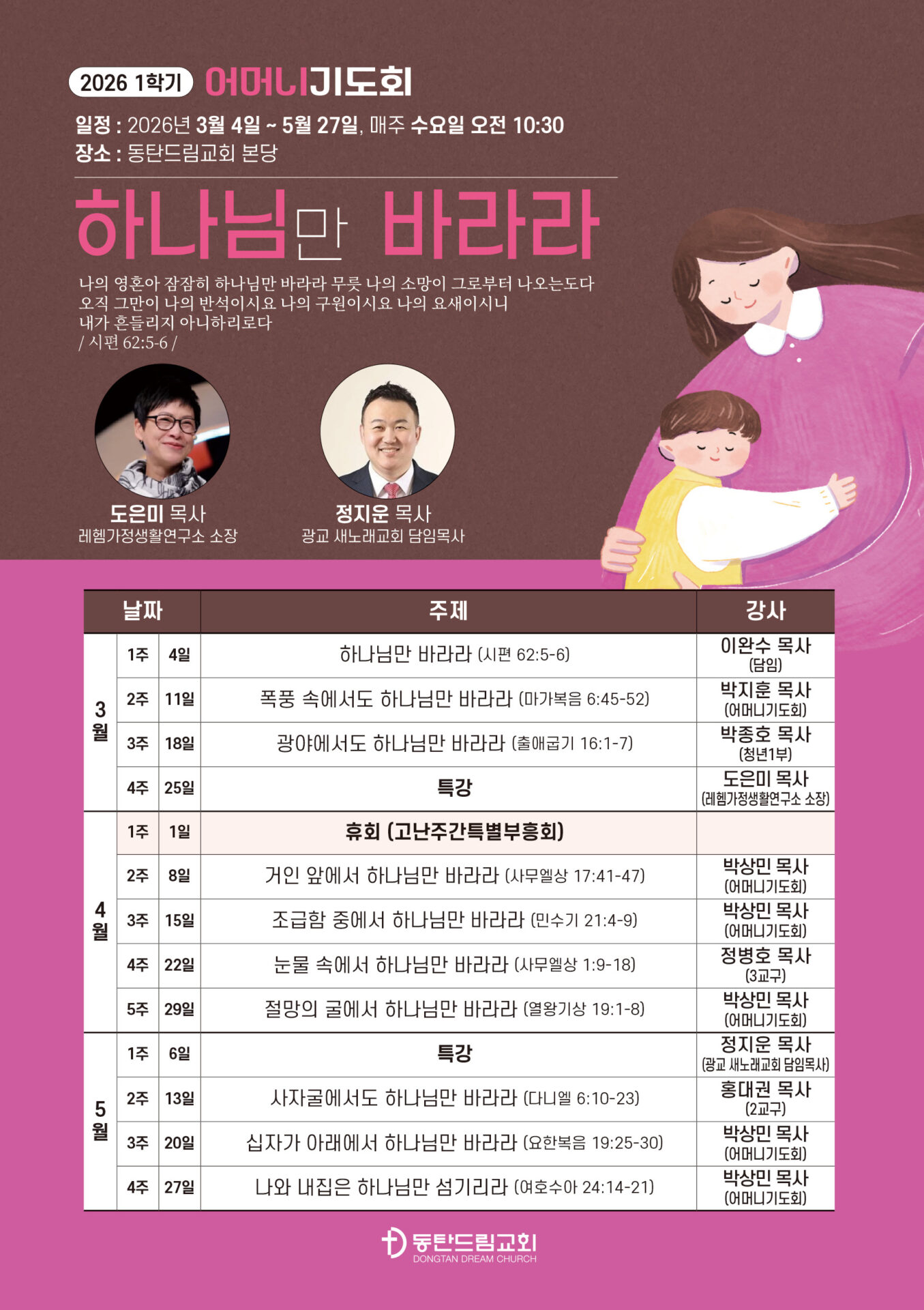 어머니기도회는 만남이 있습니다. 우리와 만나주시는 하나님과 한마음을 나누며 기도할 동역자를 얻는 만남이 있습니다.