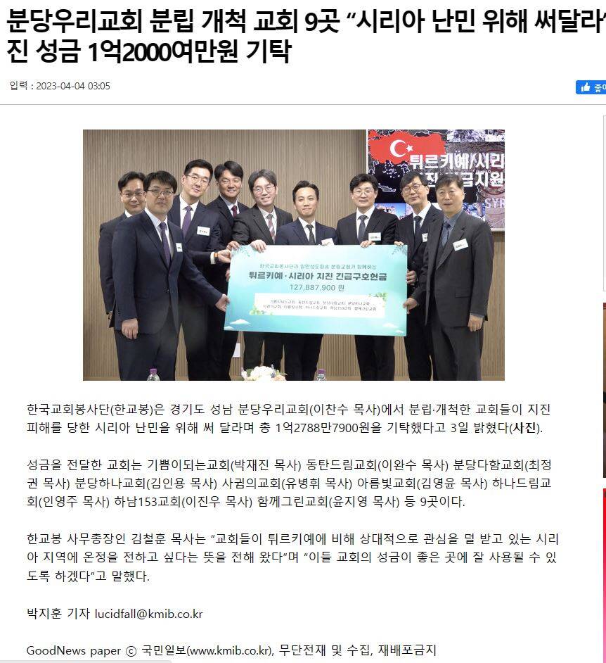 분당우리교회 분립 개척 교회 9곳 “시리아 난민 위해 써달라”… 한교봉에 지진 성금 1억2000여만원 기탁